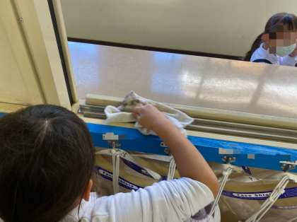 最近では、窓のふちやロッカー上のほこり、まだ掃除が終わっていない所など、自分で掃除場所を探して取り組む姿が見られます。