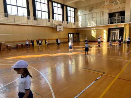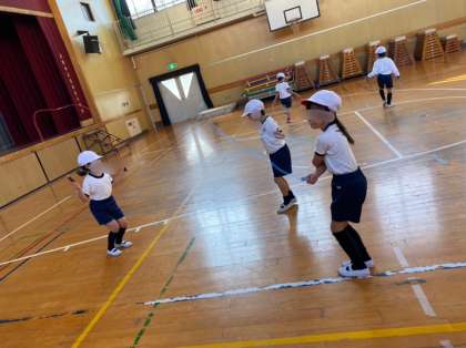 体育のはじめの10分間は、短なわでいろいろなとび方に挑戦しています。