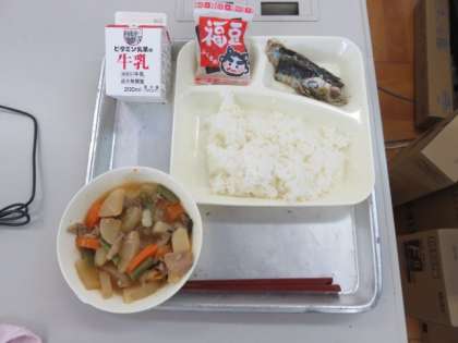 もちろん今日の給食メニューは節分メニューでした。福豆にイワシが出ました。
