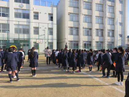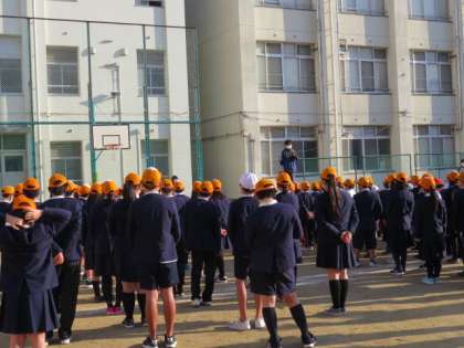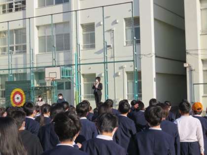 朝会では、校長先生と体育主任の先生のお話を聞きました。