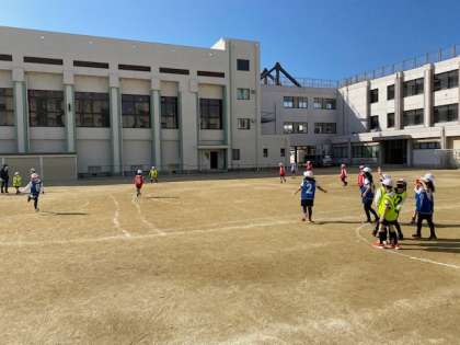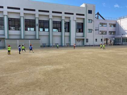 体育の「おにあそび」では、ゼッケンを着て、3色鬼ごっこをしています。