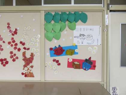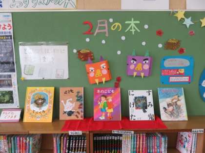 節分の飾りが印象的です。鬼が出てくる本が並べられていました。