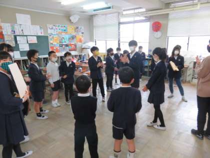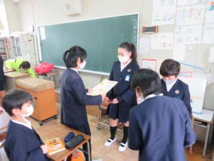 各教室にたてわり班で分かれ、感謝の気持ちを込めてお祝いメッセージの寄せ書きを渡しました。