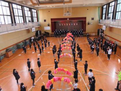 入場では卒業生がアーチを通りました。一人ひとりの顔をしっかり見て祝う会に臨みました。