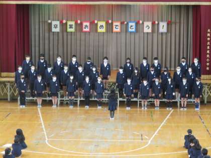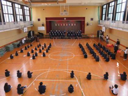 第2部は講堂で1・3・4年生と2・5年生に分かれてお祝いをしました。