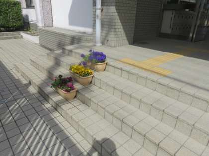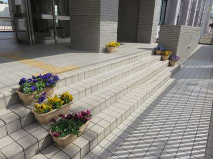 地域の方に入学式のためにいただいたお花を玄関の階段に飾りました。