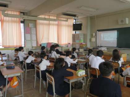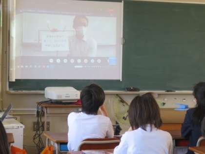 オンラインで全校朝会をしました。各学級でプロジェクターで画面を写して話をしましたが、それぞれしっかり話を聞いている様子が見られました。