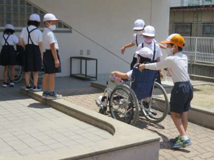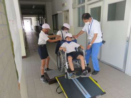 学校のスロープや段差を使用して体験をしました。