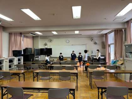 運動場が濡れていて使用できなかったので、出発式は急遽オンラインで実施しました。