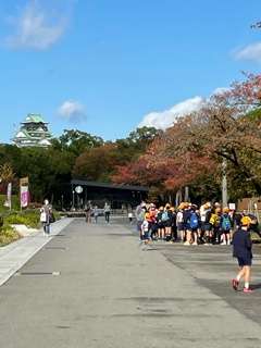 到着しました。天気も大丈夫そうです。大阪城が青空に映えています。