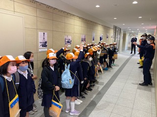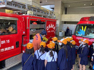 消防署内の施設見学、消防自動車のしくみ、消防署員さんの仕事内容など普段見られないこと、聞けないことをたくさん学ぶことができました。