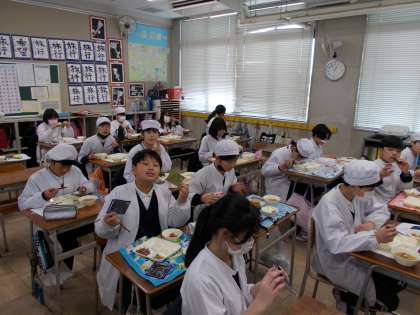 海苔に具をのせて巻いて食べます。楽しくおいしい給食に笑顔がこぼれます。