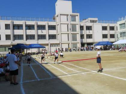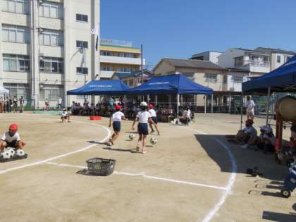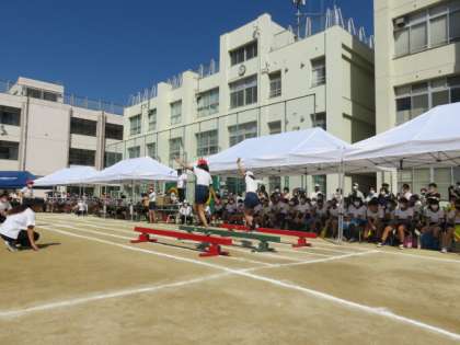 ハードルを飛び越え、棒をくぐり、ボールをけり、最後は平均台と、全力疾走しました。