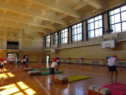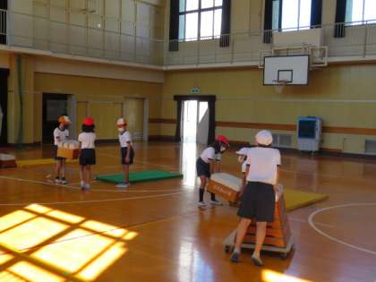 自分たちで考えて、とび箱の数や段数を変えたり、フープの数を変えたりして、いろいろなコースを作っていました。「次はこのコースをやってみよう」「先生、見ていてね」と楽しみながらとび箱に親しんでいました。