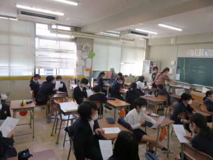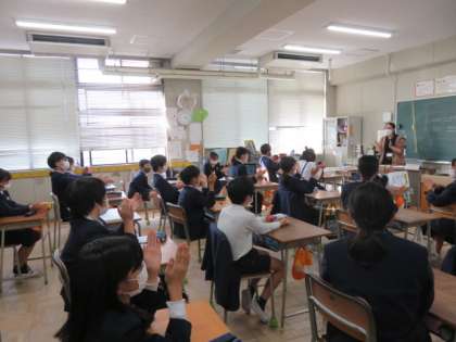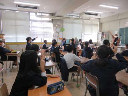 「Which do you like〜?」の表現を使ってペアでインタビューし合ったり、先生が出題する「How many〜?」の数を拍手の数で答えたりしました。正解するとみんなで喜び合い、和気あいあいと楽しみながら活動していました。