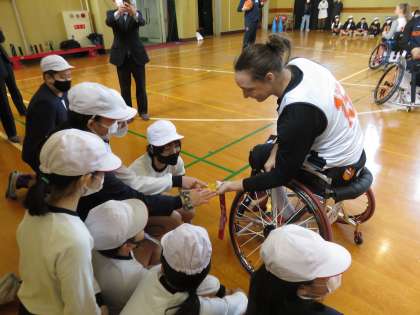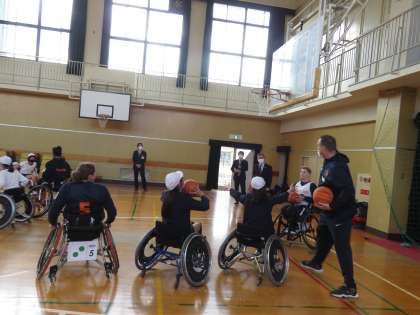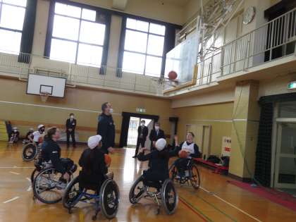 実際に子どもたちも車いすに乗せていただき、シュートをする体験をしました。