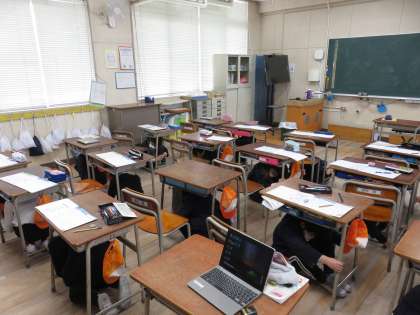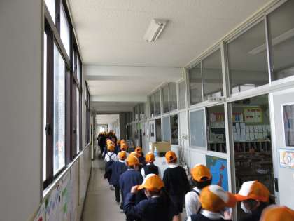 教室で地震や津波から身を守る方法について話し合い、避難訓練を行いました。