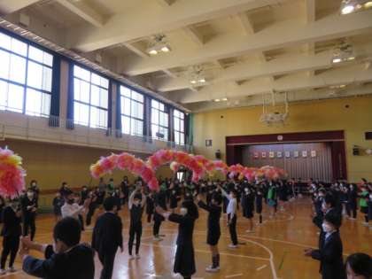 6年生が緊張した様子で一人一人アーチをくぐり、入場して卒業を祝う会が始まりました。