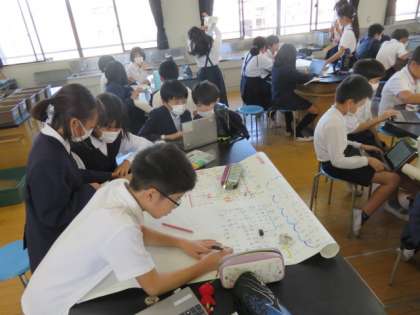 学習して分かったことや、さらに調べたことを班で新聞にまとめました。「流れる水のひみつ」「水の性質」といった記事の内容や書き表し方など、班ごとの工夫が見られました。