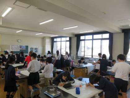 記事を書く人、タブレットで詳しく調べる人などの役割分担をしながら活動を進める様子も、さすが高学年です。
