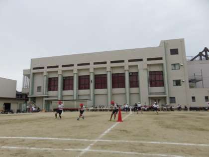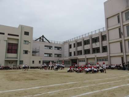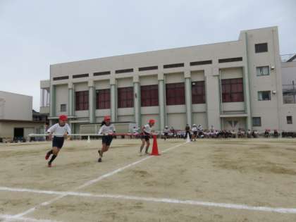 内側の人が力強く踏ん張りながら棒をまわし、真ん中と外側の人がすばやく走り、最後までいい勝負でした。練習の成果がしっかりと出ていました。