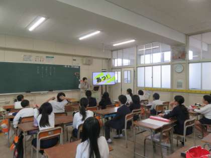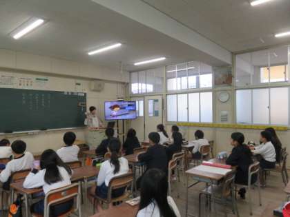 発育測定前に保健指導を行いました。けがにつながりそうな場面を見て、どんなところが危ないのか、どうすれば安全なのかを考えました。