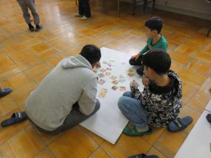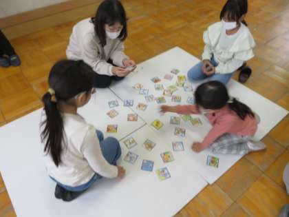 取り札と真剣ににらめっこ。地域の方に読み札を読んでもらい、見つけると「はい」と声を出して勢いよく取っていました!