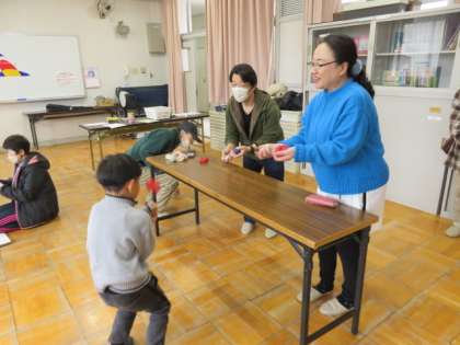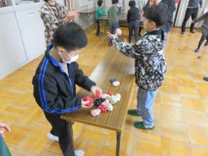 2つのお手玉を投げ分けるのがとても難しかったようですが、地域の方にお手本を見せていただきながらがんばっていました!