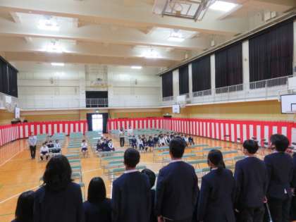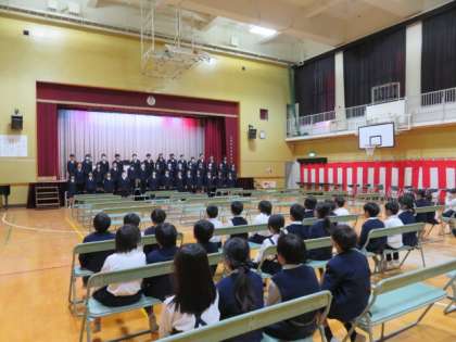 1年生は6年生の規律ある行動と呼びかけや歌の素晴らしさ、迫力に圧倒され、食い入るように見つめていました。この後、見違えるほどの態度で入学式の練習に取り組んでいました。6年生は入学式からたくさん関わってきた1年生に憧れと感動を与え、立派に手本を示してくれました。
