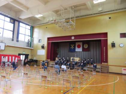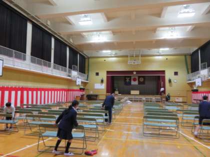 明日の入学式に向け、6年生が教室や講堂の準備や掃除をし、予行練習を行いました。