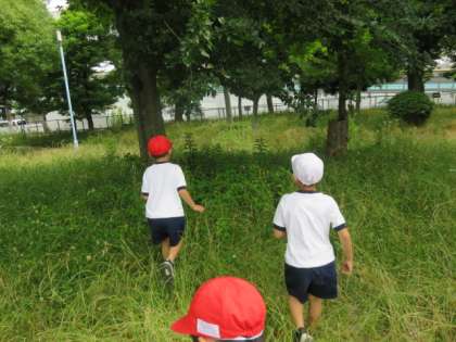 草をかきわけたり、しゃがんで地面に顔を近づけたりして、夏の生き物を探していました。