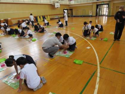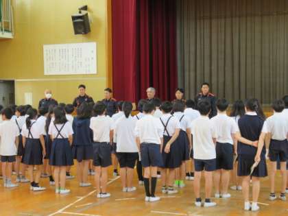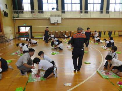 消防隊の方に救急救命講習を行っていただきました。心臓マッサージのポイントを教えてもらい2人ペアで5分間交代しながら継続する活動を行いました。意外に大変な動作に、「しんどい」「交代しよか?」声を掛け合いながら集中して取り組みました。知識があればできることが増えていきます。経験をつめば対応できることも増えます。人のために行動できる人をめざしていきます。