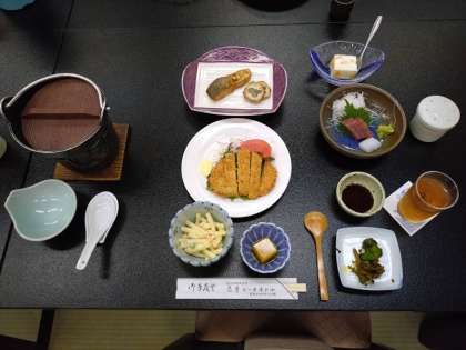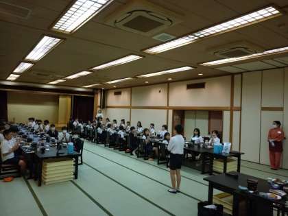 避難訓練が終わり今から夕食をいただきます。豪勢な食事に子どもたちは大喜びです。食べすぎないか、、、心配です。