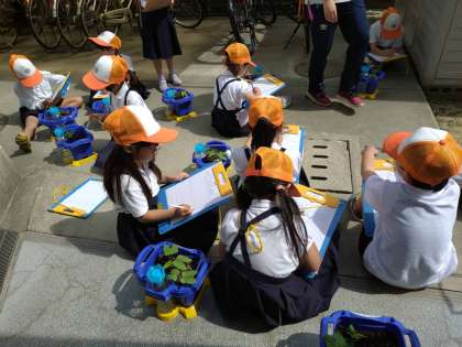 育ってきたアサガオの葉をまびき、2本にしました。その後ふた葉より大きくなった葉のスケッチをしました。