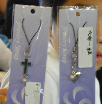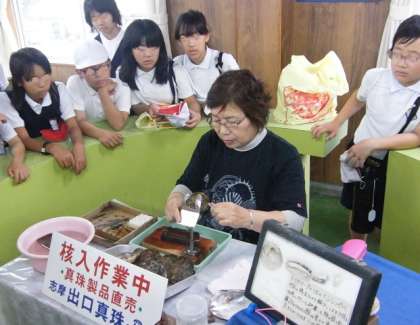 ◆写真上……あこや貝から真珠を取り出した児童は、キィフォルダーやネックレス、タイピン等、真珠を取り付ける台座を選び、「出口真珠」の方に手渡します。