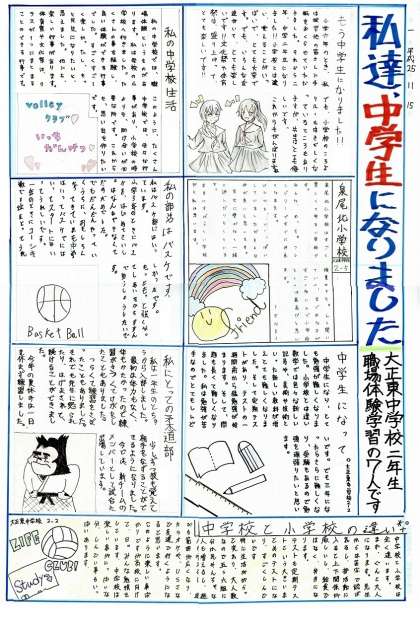◆11月14日・15日、大正東中学校の2年生7人が職場体験学習で、本校を訪れました。7名の中学生は、6年生のとき(平成24年3月)に復興支援のハガキ新聞を作成していましたので、その続きとして、今回は中学校生活を紹介する復興支援壁新聞を作成しました。2年ぶりの復興応援新聞になります。この新聞は、12月12日に、鵜住居小学校に送付しました。