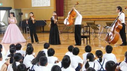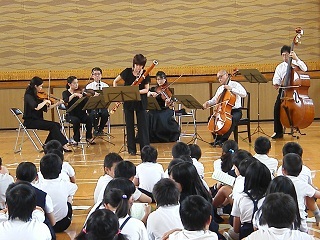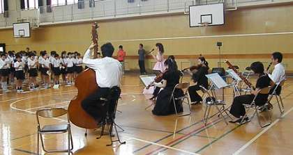 6月3日(月)、本校に「京都フィルハーモニー室内合奏団(京フィル)」をお招きしました。司会と歌を担当される「歌のお姉さん」・島崎さんの他に、ヴァイオリンやチェロ、クラリネット等、6楽器・7人が来られ、アンコールを含めて8曲を披露してくださいました。