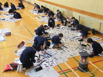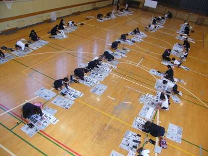 1・2時間目に6年生、3・4時間目に3年生が体育館に集まり、学年全員で書き初めを行いました。