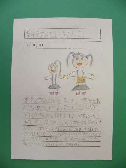 学校案内をしました。1年生を案内して、途中で止まって、ここで何をするか教えてあげます。シールを貼ったり、手をつないで連れて行くのが、楽しかったです。人がいっぱいいて、並んでいる間に列に間が空いてしまいました。とっても、追いつくのが大変でした。でも、楽しかったです。連れて行った子と休み時間に遊びたいなぁと思いました。