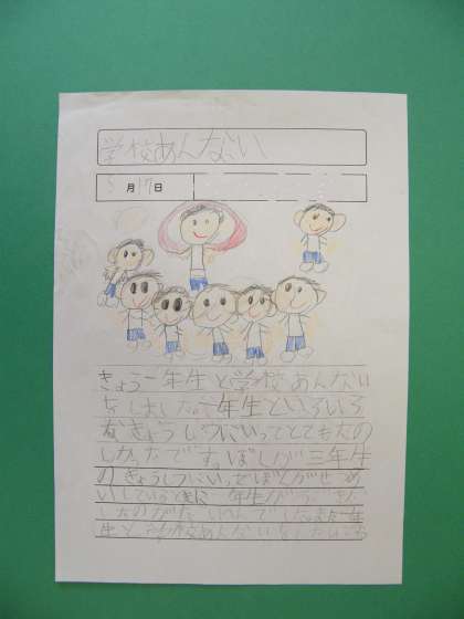 今日、一年生と学校案内をしました。一年生といろいろな教室に行って、とても楽しかったです。ぼくが三年生の教室に行って、ぼくが説明しているときに、一年生が動き出したのが大変でした。