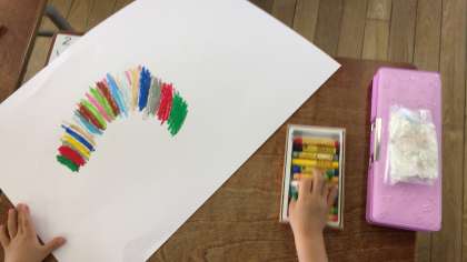 一年生が図工でクレヨン・パスを使った描写技法に挑戦していました。