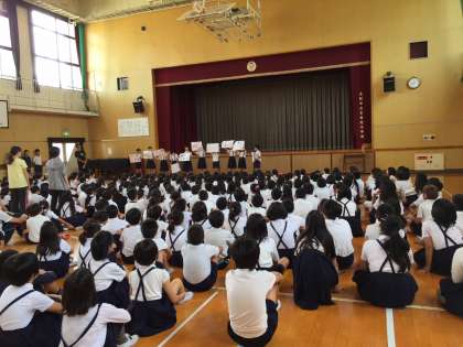 今日の朝の集会は土曜授業でやる「お店屋さん」の紹介でした。