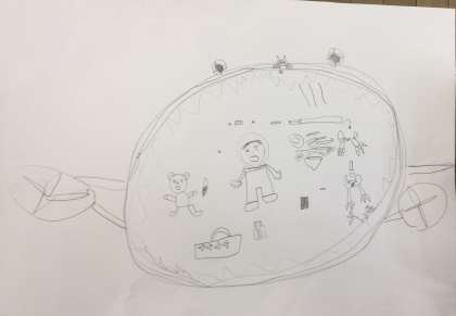 一年生が「乗れるものの絵}を描いていました。