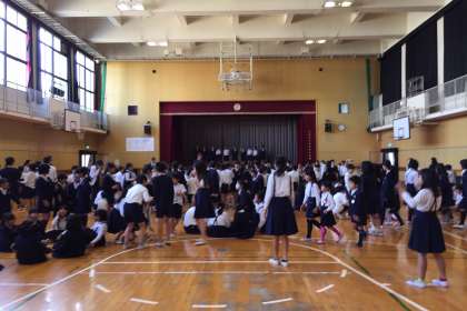 今日は表彰で3年生の男の子の「習字」と先日の区民祭りの「女子リレー3位」を表彰しました。