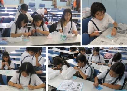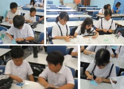 昨日、砂浜散策で集めた貝殻を使って表現します。