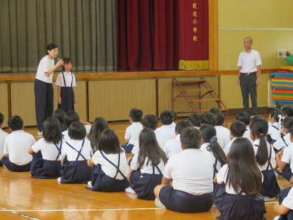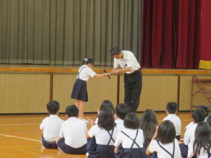 2学期から仲間に加わる新しい先生、新しいお友達の紹介の後、3年生児童に図工作品展の表彰がありました。