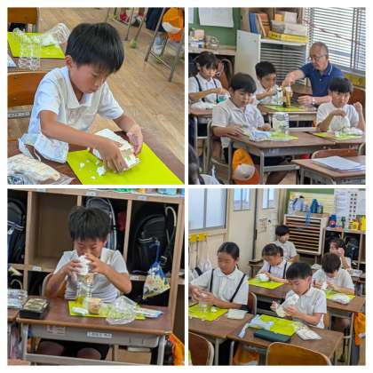 紙パックやペットボトルを土台に素敵な家の粘土細工をつくっています。