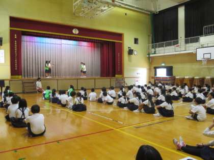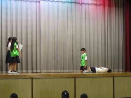 今朝の児童集会で、各班の6年生が、班で行う出し物を紹介し、その魅力をアピールしました。