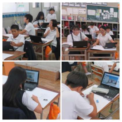 撮った校内風景をもとに画用紙に描いています。
