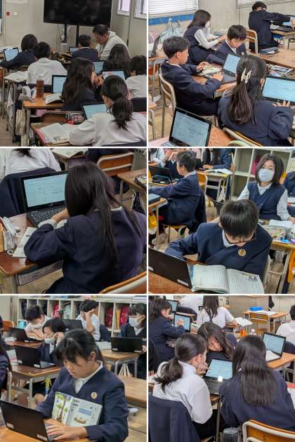 「大造じいさんとがん」のワークシートをスライドに反映させて書き込んでいます。